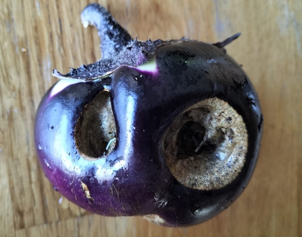 I thought back to this discussion the other day when I was harvesting two small, sorry-looking aubergines. As previously mentioned, the slugs have had a bumper year in my garden, and these pathetic specimens were not spared. The slugs had eaten their way right through them, creating tunnels for the convenience of other insects looking for a home. I took out my knife and started to cut out the eaten parts in order to salvage what I could of the remaining flesh. I displaced a woodlouse from the first aubergine, but didn’t think much of it. When I cut into the second aubergine, however, I discovered a whole woodlouse family with a few tiny woodlice. I felt absolutely dreadful, I had not only destroyed their home but also broken up the family. I made a pathetic attempt to reunite them as I put the remains carefully in the compost heap.